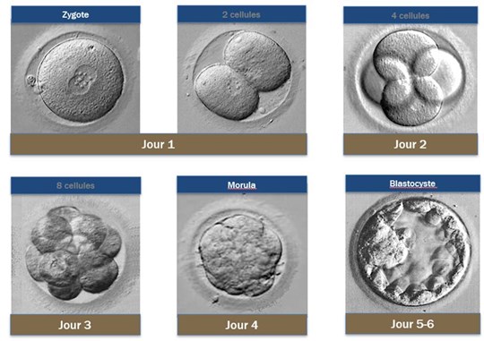 Le succès de la fécondation est évalué dès le lendemain de la ponction, à J1, par la présence de deux noyaux (l’un provenant de l’ovocyte, l’autre du spermatozoïde). Dans les jours qui suivent, en cas de développement embryonnaire normal, le nombre de cellules est multiplié par 2 toutes les 24h.
