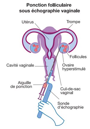 La ponction folliculaire est réalisée par le gynécologue, à l’aide d’une sonde échographique par voie vaginale, sous analgésie ou anesthésie (générale ou locale). Le contenu des follicules est aspiré, et les liquides folliculaires sont transmis au laboratoire pour la recherche des ovules au microscope.