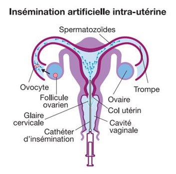 L’insémination intra-utérine (ou insémination artificielle) consiste à reproduire un cycle naturel à l’aide d’injections hormonales afin de permettre le développement puis l’ovulation d’un follicule (parfois deux), et de synchroniser cette dernière avec le dépôt de spermatozoïdes dans la cavité utérine, qui remonteront ensuite dans les trompes jusqu’à l’ovule.